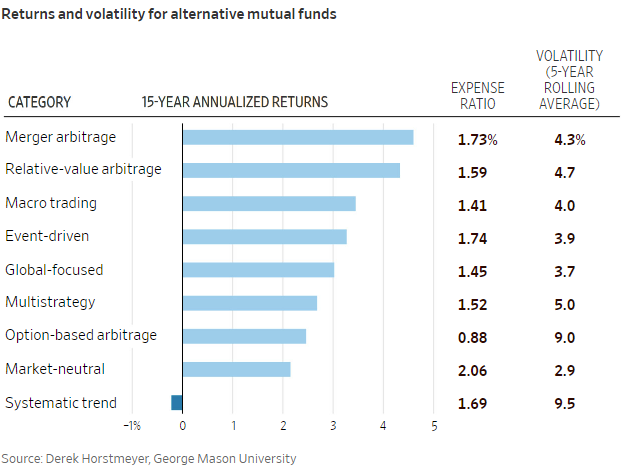 On the top end, the best-performing group was merger arbitrage with an annualized return of 4.6% over the past 15 years and annualized volatility of 4.3%. Most of the other categories of alternative mutual funds we researched had similar risk-return profiles to these numbers.