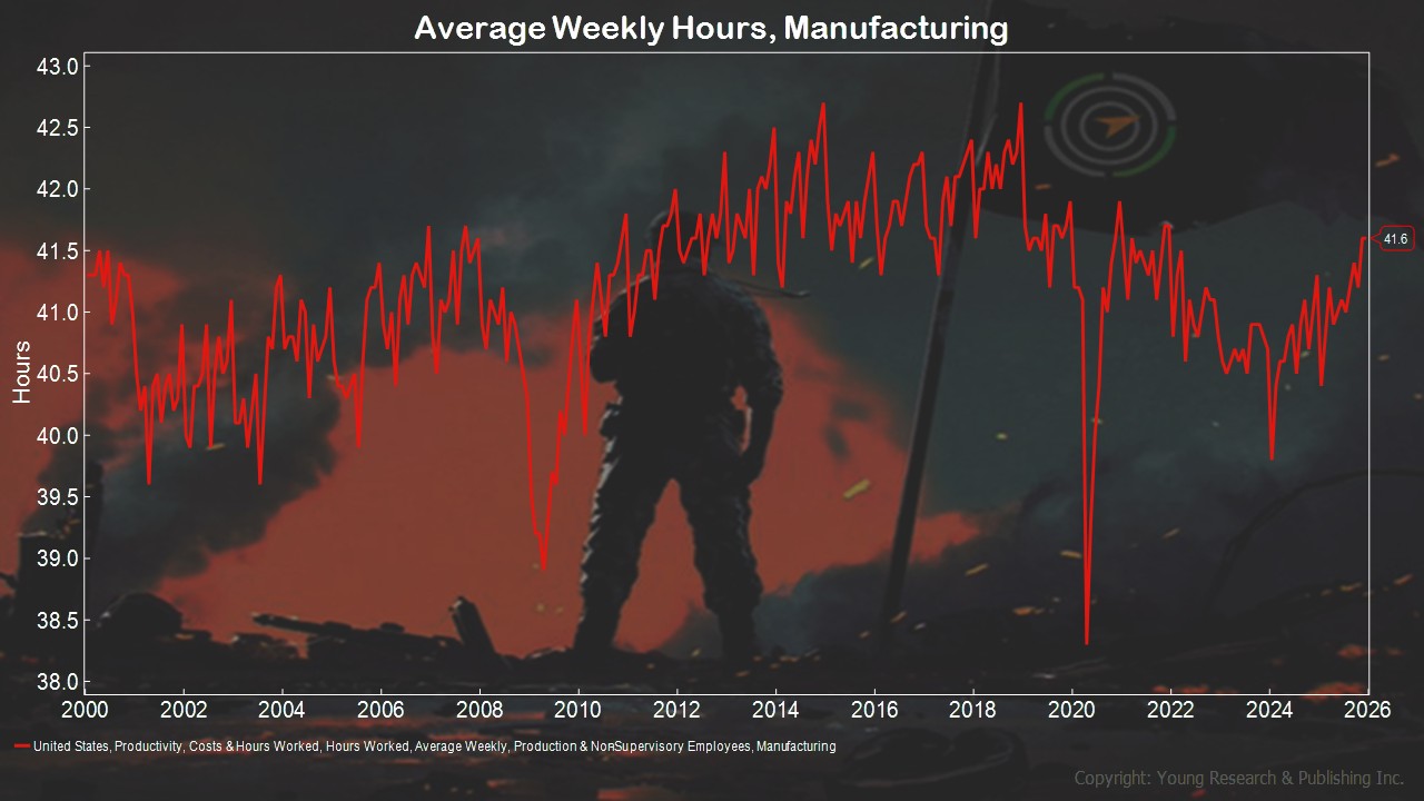 - Slide 39, average weekly hours for manufacturing employees are booming at 41.6 hours. At some point, these manufacturers are going to need to hire more employees to pick up the extra work.