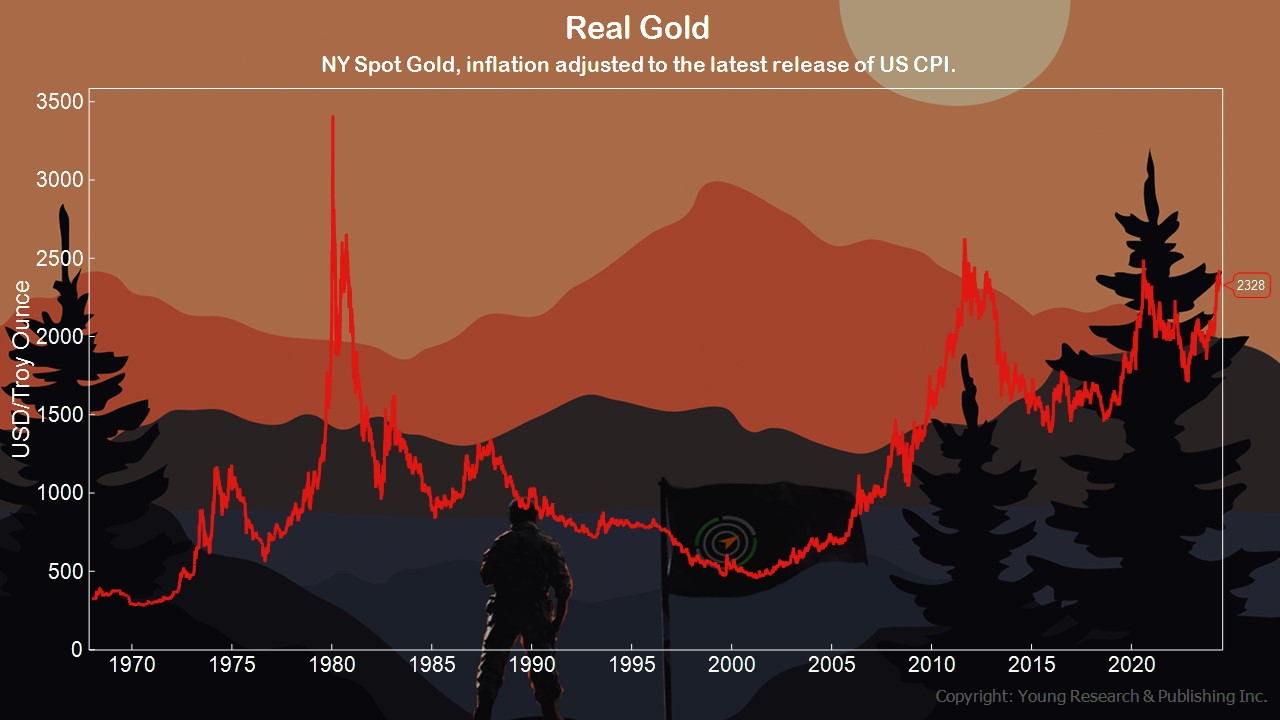 Gold prices are near all-time highs, but a look at Your Survival Guy’s real (inflation-adjusted) gold chart below shows that gold still has some room to run before it reaches new record highs.